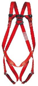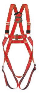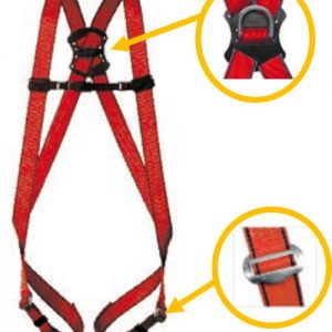 Arnês com elásticos. Ponto de ancoragem dorsal e frontal com anel. Conexão de fivela de regulação nas pernas e no peito. Fivela de ajuste nas alças dos ombros. Peso de 1.220 gr.